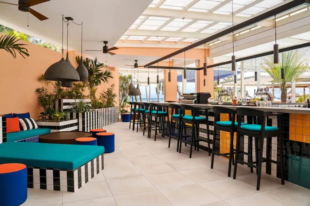 酒店以海藍色、蜜桃色和醒目的單色條紋搭配而成,讓整個空間充滿活力。外沙發床、椅子和靠墊都采用鈷藍色和綠松石色調作為裝飾,以模仿印度洋的色調。