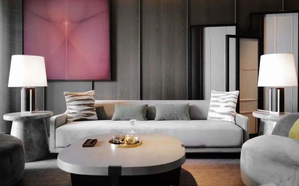 主色調以木質與暗灰為主,將新中式元素融合,典雅韻味且恢弘。